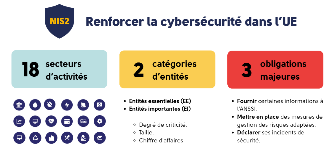 La directive NIS2, adoptée en décembre 2022, a pour objectif d’élever le niveau de cybersécurité au sein de l’Union européenne, en élargissant le nombre d’entités concernées, en renforçant les obligations de gestion du risque, de notification d’incidents, de chaîne d’approvisionnement, et en impliquant les instances de direction (Cf. NIS2compliant.org).