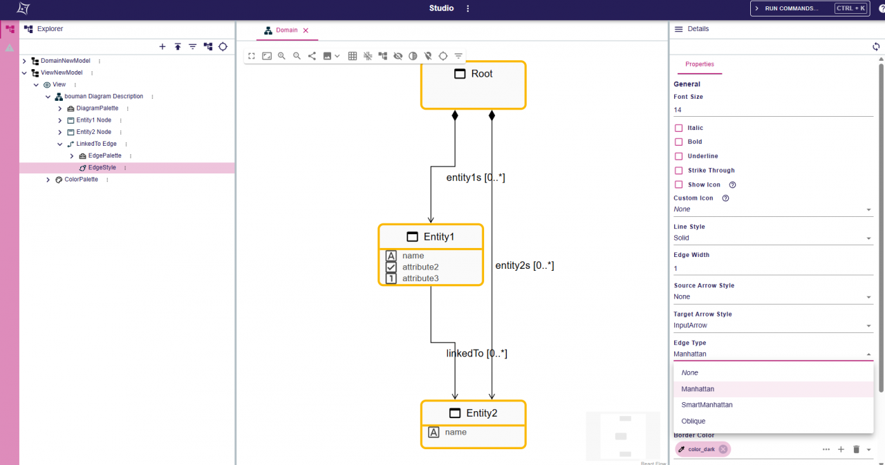 - Manhattan (default): keeps the edge rectilinear, with bending points to adjust layout precisely.